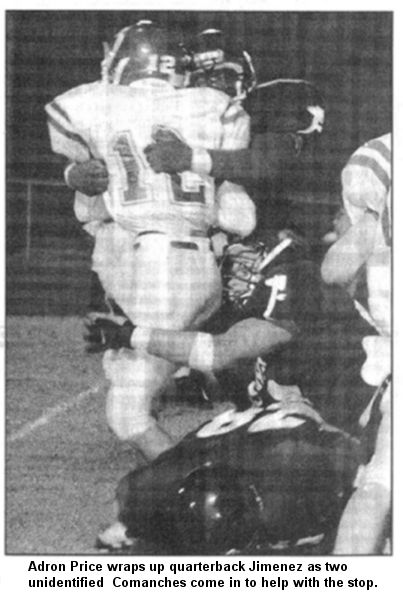Adron Price wraps up quarterback Jimenez as two unidentified Comanches come in to help with the stop.
