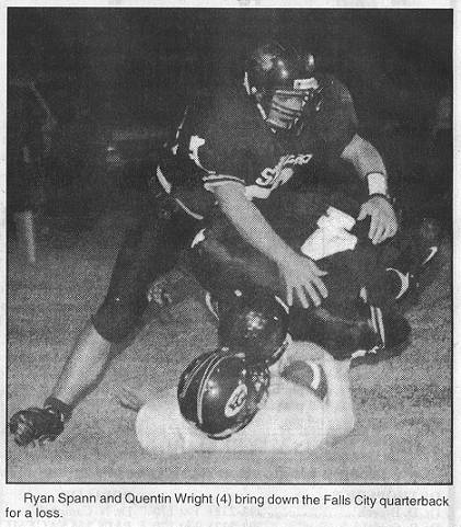 Ryan Spann and Quentin Wright (4) bring down the Falls City quarterback for a loss.