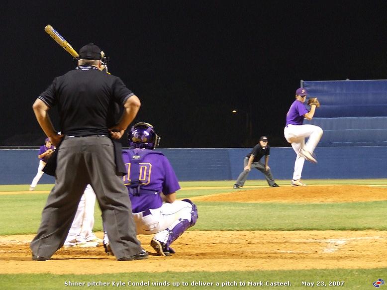 Shiner pitcher Kyle Condel winds up to deliver a pitch to catcher