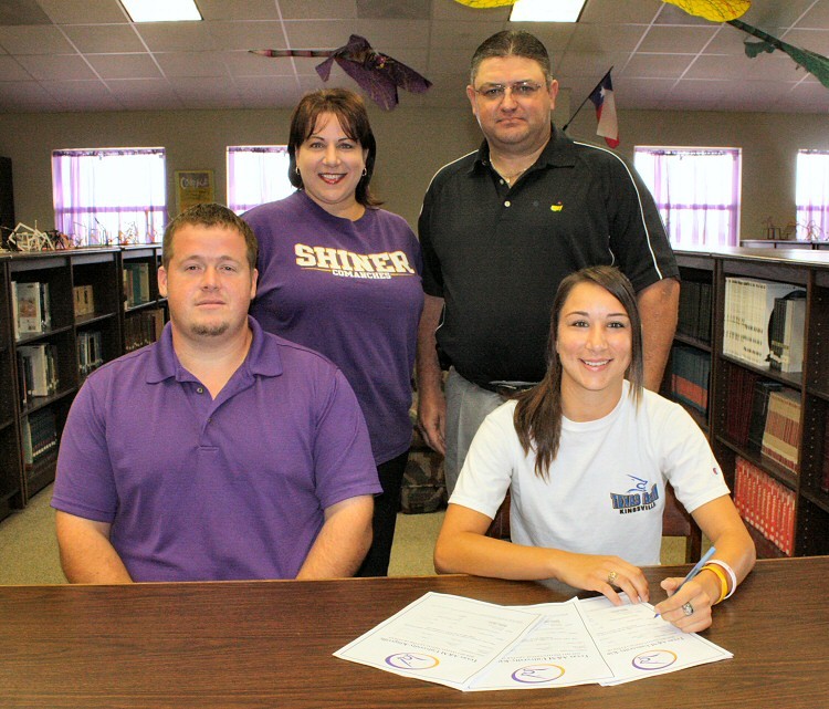 Shiner athlete Amber Ramirez signs her letter of intent to run track at Texas A&M Kingsville next season. Track Coach Wendell Boner, left, and Amber's parents, Laura and Mike Raindl, look on.