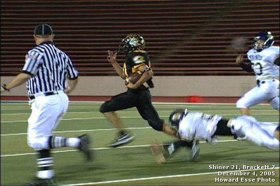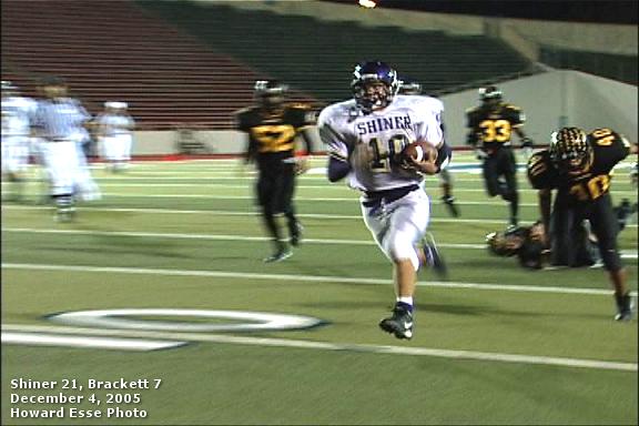 Shiner running back Chris Baer breaks free of the Brackett defenders on the way to his second touchdown during Saturday's game at Alamo Stadium in San Antonio. photos by Howard Esse, Crossroads Legal Video