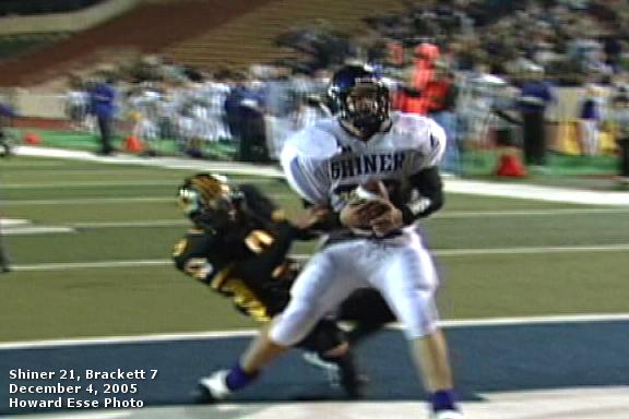 Shiner receiver Chase O'Connor hauls in a touchdown pass from Kyle Condel to give Shiner a 13-7 lead over Brackett.