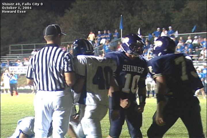 Running back Chris Baer celebrates a TD with lineman Clayton McCorkle during Shiner's victory over district rival Falls City on October 1, 2004. photo by Howard Esse, Crossroads Legal Video