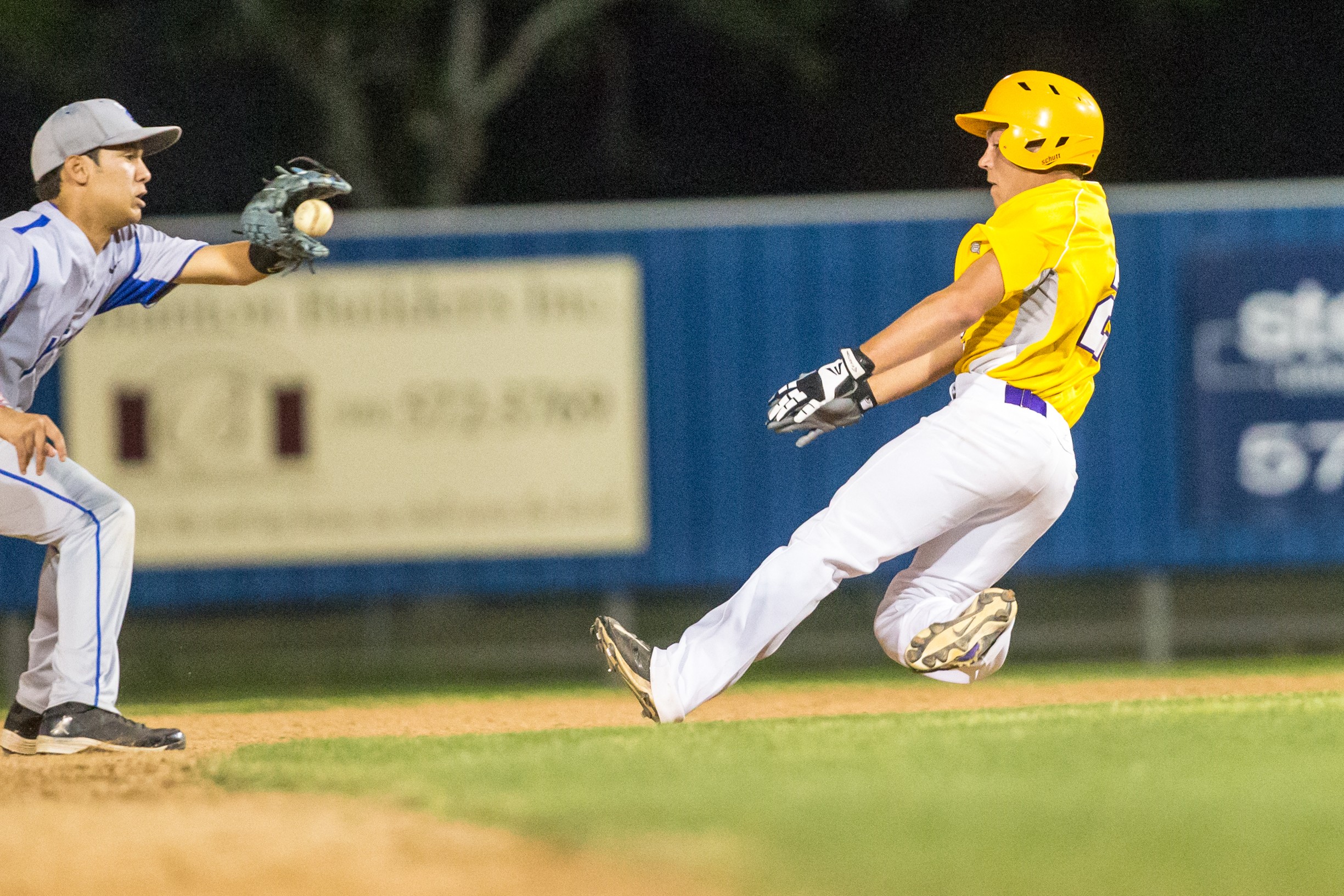 Shiner's Tyler Patek successfully slides into second base against St. Joseph's Travis Bigham during Monday's game at Riverside Stadium.