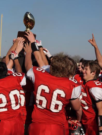 Shiner St. Paul players raise the state championship trophy. St. Paul beat Colleyville Covenant 48-41, remaining undefeated for their season. photos by Gonzales Cannon