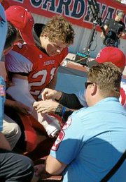 Sophomore Adam Hollenbach is tended to by medics after breaking his arm in a second quarter offensive tackle.