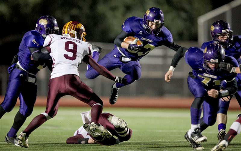 Chad Neubauer of Shiner leaps past Thorndale's Rowdy McCoy, on ground, and Karl Woelfel, left, in the first quarter at Shelton Stadium on Friday December 6, 2013.