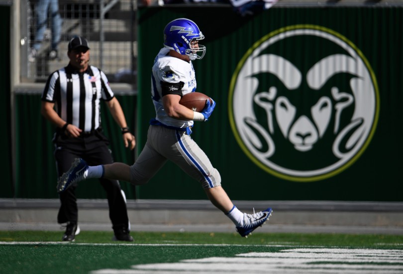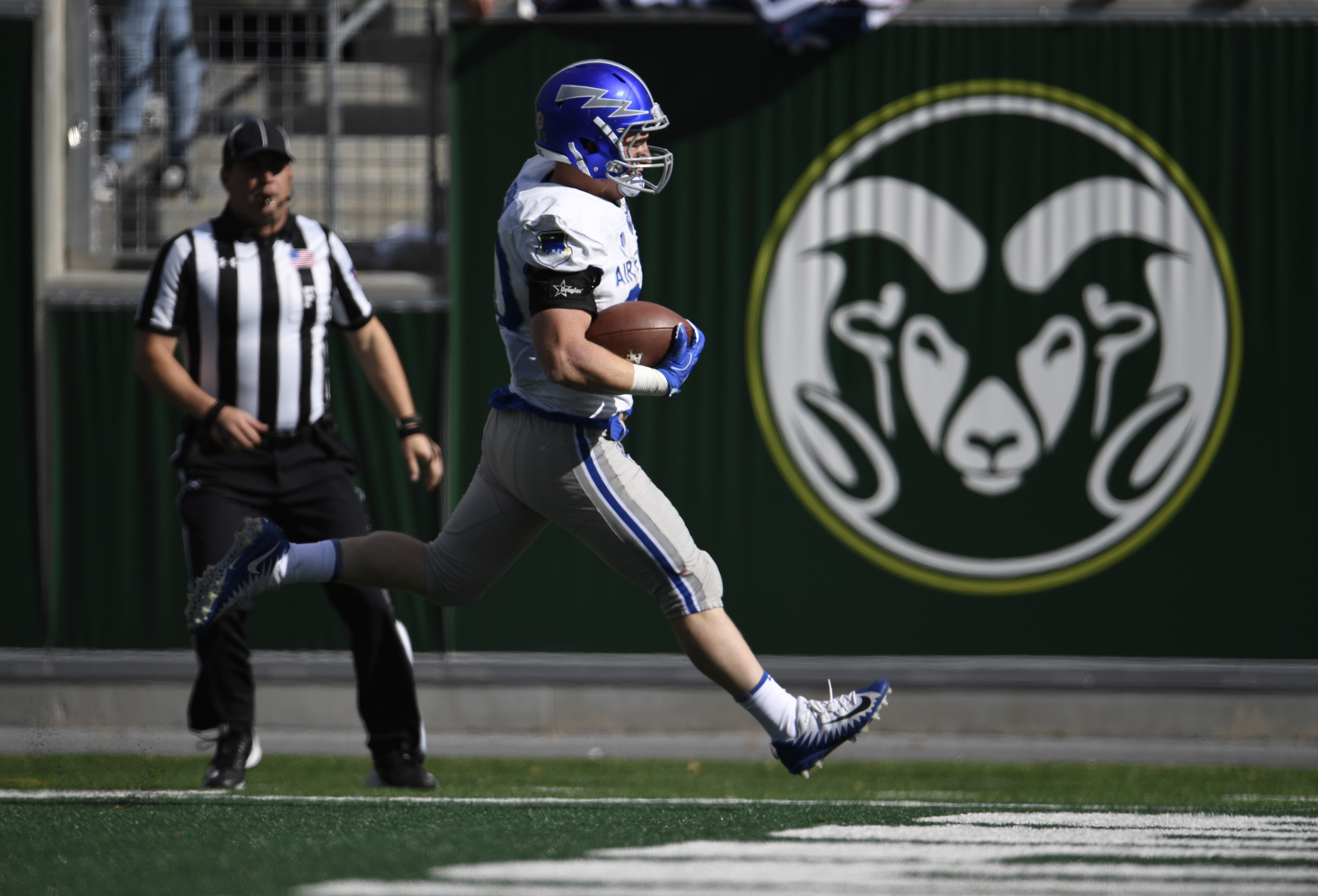 Air Force Falcons fullback Jacob Stafford #30 heads to the end zone for touchdown against the Colorado State Rams in the second quarter at the Colorado State University Stadium.