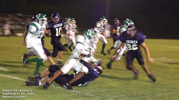 GAME STATISTICS: Boling Shiner First Downs 5 20 Rushes-Yards 25-69 40-403 Passing Yards 40 0 Comp-Att-Int 9-21-4 0-3-1 Punts 5-28.4 1-53 Fumbles-Lost 3-1 1-0 Penalties-yds 5-36 5-48 INDIVIDUAL STATISTICS: Rushing - Shiner, Chris Baer 13-158, Isaac Casares 7-40, Kyle Condel 6-41, Trey Curtis 4-40, Ryan Kloesel 4-25, Kenzley Wright 7-97. Boling, Wayland Griggs 12-17, Richard Pettis 1-0, Ronald Pettis 1-2, Joel Simpson 8-41, Ketrail Waddy 3-9. Passing - Shiner, Trey Curtis 0-3-1-0. Boling, Wayland Griggs 9-21-4-40. Receiving - Boling, B.W. McCleod 1-11, Joel Simpson 5-22, Jamarick Spradley 1-3, Ketrail Waddy 2-2. Interceptions -- Shiner: Jared Boedeker 1; Chase O'Connor 1; Ryan Kloesel 1; Kevin Berger 1. Boling: Flint Gardner 1. SCORING SUMMARY: 1 2 3 4 F Boling 0 0 0 0 -- 0 Shiner 12 27 14 7 -- 60 SCORING DETAILS: First Quarter S - Kenzley Wright 33 run (kick failed), 8:25 S - Chris Baer 22 run (run failed), 2:45 Second Quarter S - Trey Curtis 22 run (kick failed), 11:45 S - Chase O'Conner 47 interception return (Scott Shimek kick), 9:20 S - Wright 22 run (Shimek kick), 7:37 S - Baer 4 run (kick failed), 2:56 Third Quarter S - Baer 19 run (Shimek kick), 10:48 S - Ryan Kloesel 5 run (Kloesel kick), :22 Fourth Quarter S - Isaac Casares 4 run (Kloesel kick), 3:30