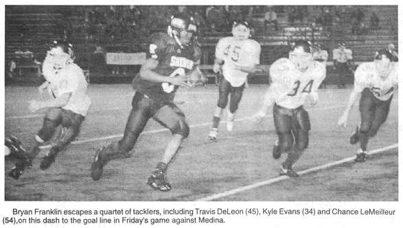 Bryan Franklin escapes a quartet of tacklers, including Travis DeLeon (45), Kyle Evans (34) and Chance LeMeilleur (54), on this dash to the goal line in Friday's game against Medina.