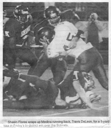 Shawn Flores wraps up Medina running back Travis DeLeon for a 1-yard loss in Friday's bi-district win over the Bobcats. (photos by Shiner Gazette)