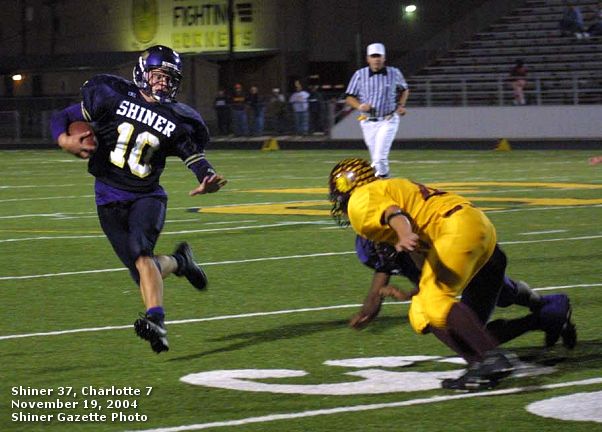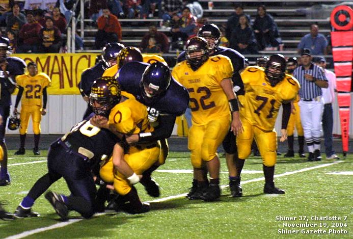 While the Shiner defensive line kept Charlotte's running game in check, the Shiner secondary intercepted two passes and broke up numerous others to stymie the Trojan air attack.