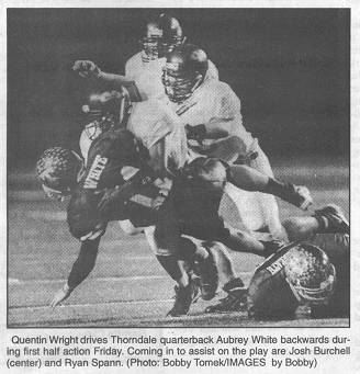 Quentin Wright drives Thorndale quarterback Aubrey White backwards during first half action Friday. Coming in to assist on the play are Josh Burchell (center) and Ryan Spann.
