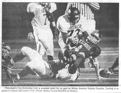 Thorndale's Coy Schneider (4) is wrestled down for no gain by Shiner lineman Robbie Pavelka. Coming in to assist is Clayton McCorkle (73).