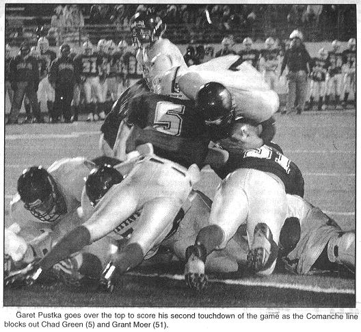 Garet Pustka goes over the top to score his second touchdown of the game as the Comanche line blocks out Chad Green (5) and Grant Moer (51).