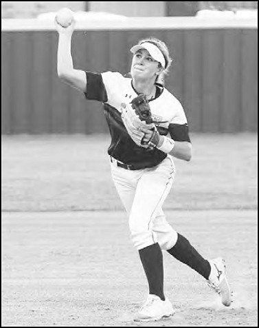 Senior second baseman Lauren Schuette launches a pass toward home plate and catcher Madison Jalufka for an out
