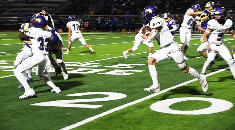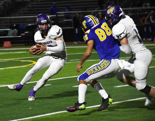 Bode Werner (left) looks to avoid some trouble against Freer last Friday. Werner scored two touchdowns and was 4-of-5 on extra-point attempts. all photos by Mark Lube