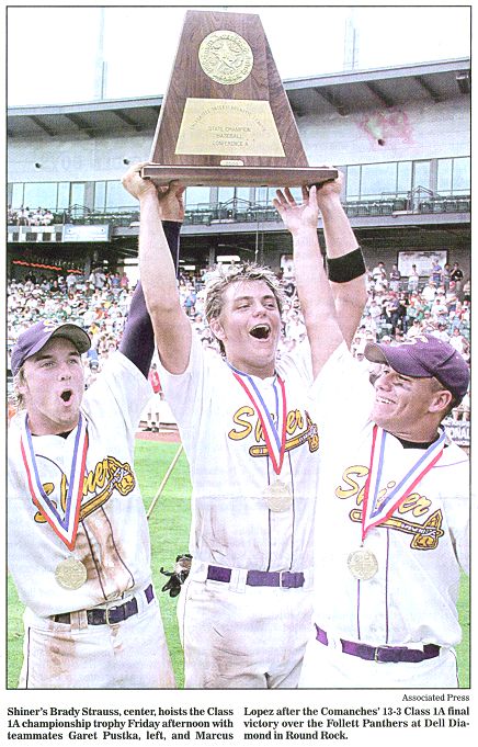Shiner's Brady Strauss, center, hoists the Class 1A championship trophy Friday afternoon