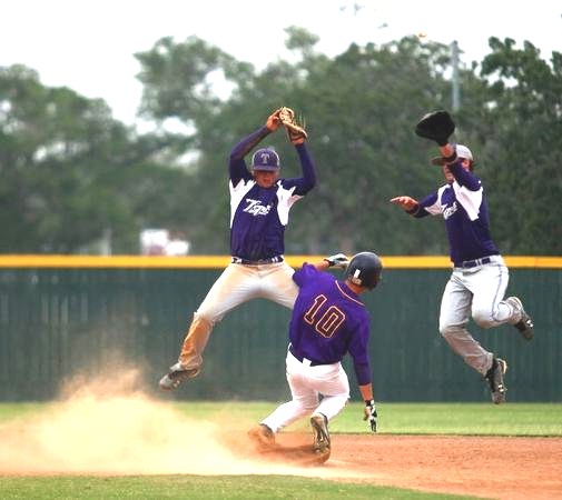 and Tucker Lovelace jump for the fly ball during Game 1 on Friday in La Grange.
