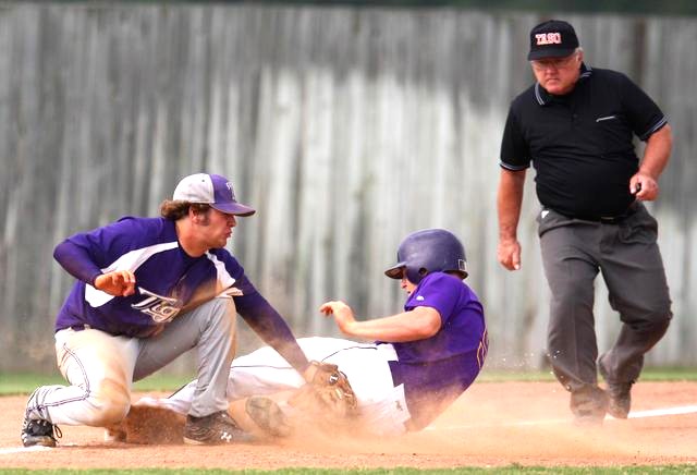 Shiner's Jacob Stafford slides in safe as Thrall third baseman Colton Mikulencak