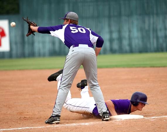 Shiner's Jacob Stafford dives back to first as Thrall's Cody Carter catches