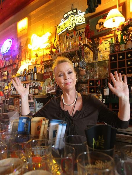 Beverly Sanders, owner of Antiques, Art & Beer in Shiner throws up her hands