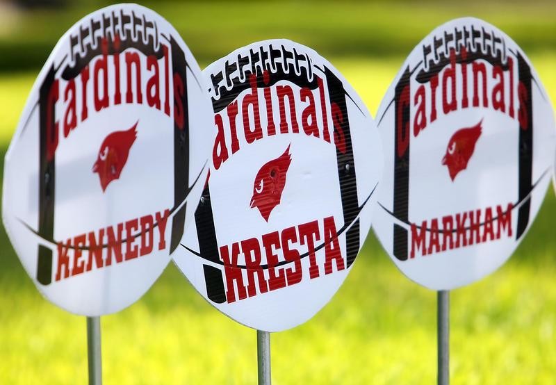 rolls out the football signs with players names in bright red letters in