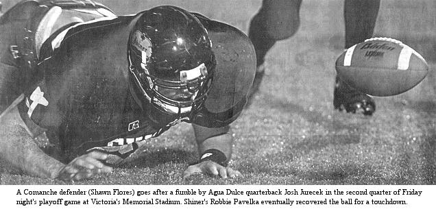 Memorial Stadium. Shiner's Robbie Pavelka eventually recovered the ball