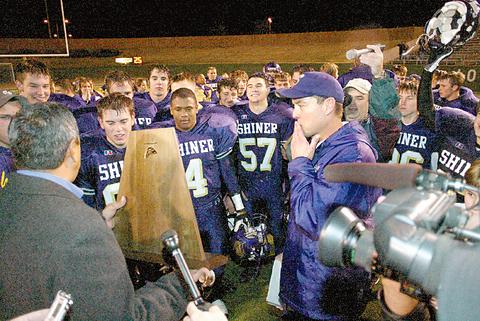 Shiner head coach Steven Cerny, center, chats with defensive coordinator