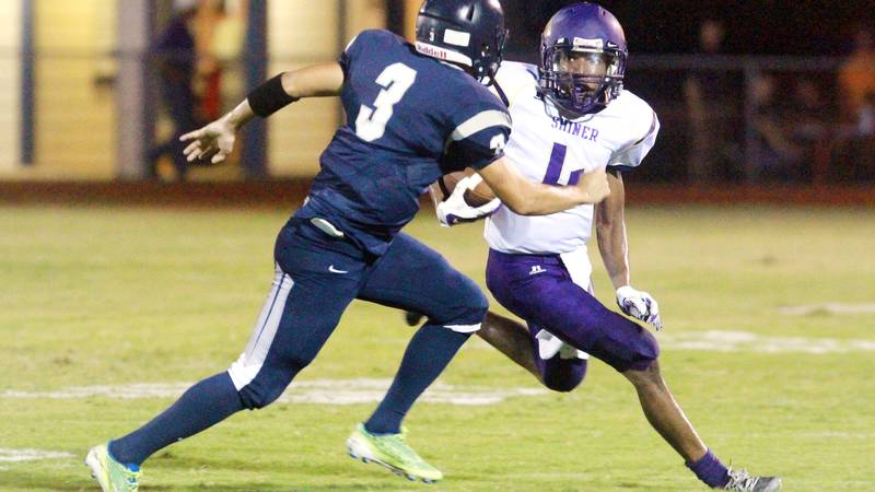 Shiner receiver Dadrian Taylor looks for some running room to avoid a Goliad defender during Friday night’s game at Tiger Stadium in Goliad.