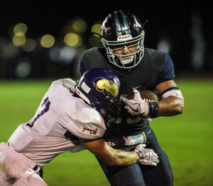 Goliad's Daniel Rodriguez gets tackled by Shiner's Tyler Palmer during Friday's ( September 28, 2018 ) Shiner vs. Goliad game at Tiger Stadium.