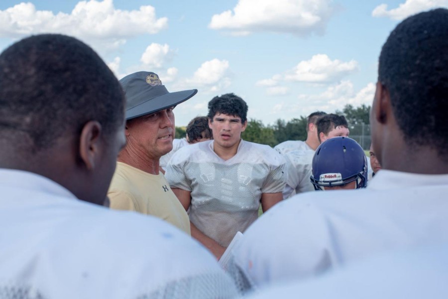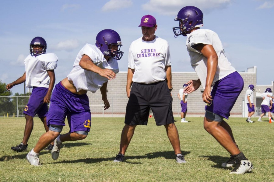 Shiner coach Steven Cerny speaks to his players during football practice in Shiner. Advocate File Photo
