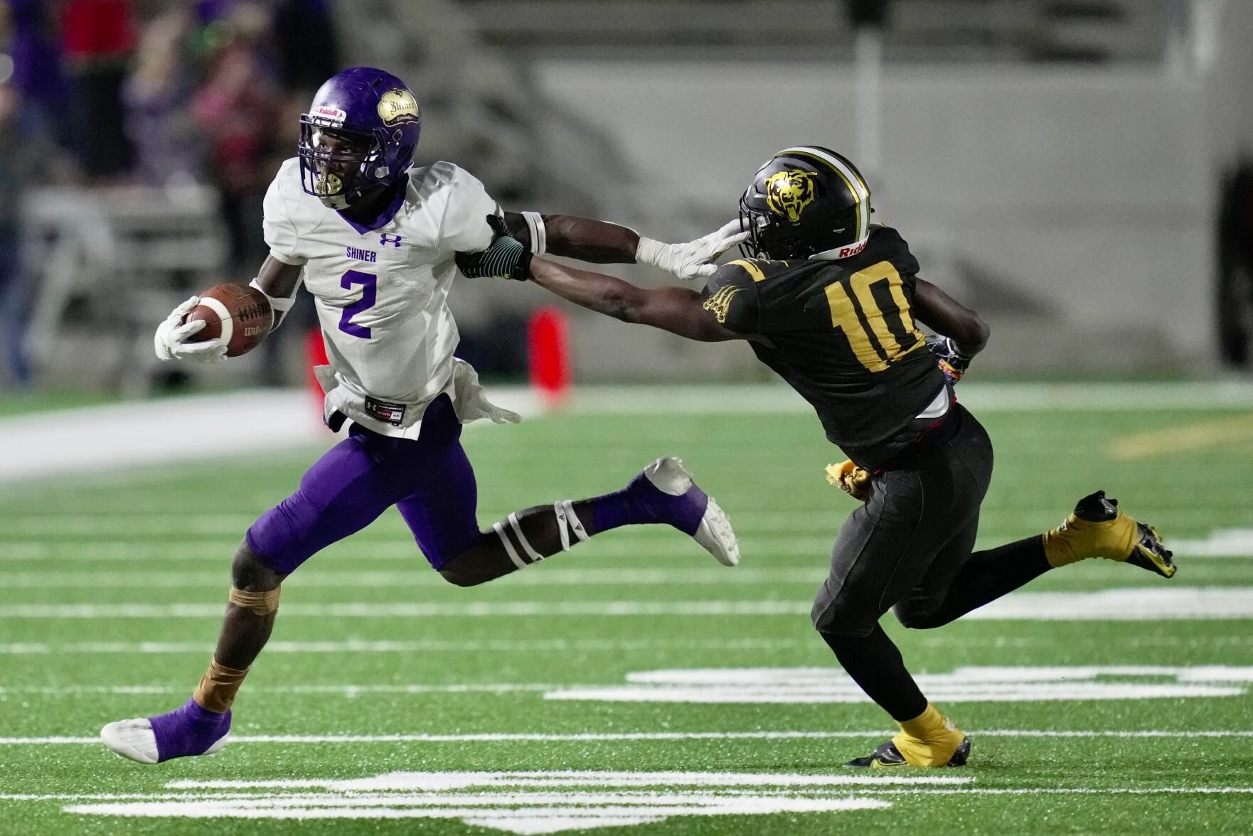 GAME STATISTICSsource: Victoria Advocate Game Statistics, December 10, 2021 Shiner 35, Timpson 28 2A-DI State Semifinal Playoff Game Thursday, December 9, 2021, 7:00 p.m. Tomball ISD Stadium, Tomball SCORING SUMMARY 1 2 3 4 F Shiner 7 14 7 7 -- 35 Timpson 7 0 7 14 -- 28 SCORING DETAILS: First Quarter S - Tyler Bishop 10 pass from Drew Wenske (Ryan Peterson kick), 4:36 T - Vosky Howard 14 pass from Terry Bussey (Geovanni Bryant kick), 1:25 Second Quarter S - Doug Brooks 7 run (Peterson kick), 8:31 S - Doug Brooks 32 run (Peterson kick), 5:53 Third Quarter S - Dalton Brooks 2 run (Peterson kick), 6:20 T - Terry Bussey 99 kickoff return (Bryant kick), 6:02 Fourth Quarter T - Braden Courtney 1 run (Bryant kick), 9:08 S - Doug Brooks 1 run (Peterson kick), 6:58 T - Bussey 40 run (Bryant kick), 6:32 TEAM STATISTICS: Shiner Timpson First downs 26 16 Yards rushing 56-410 30-170 Yards passing 55 129 Passes 4-4-1-0 10-15-1-2 Punts -- 23 Fumbles-lost 1-1 0-0 Penalty-yards 3-15 2-15 INDIVIDUAL STATISTICS: Rushing Shiner: Dalton Brooks 34-243 TD, Doug Brooks 18-123 3 TDs, Drew Wenske 3-46, Team 1-(-2). Timpson: Terry Bussey 12-105 TD, Braden Courtney 18-65 TD. Passing Shiner: Wenske 4-4-0 55 TD. Timpson: Bussey 10-15-2 129 TD. Receiving Shiner: Tyler Bishop 3-35 TD, Eli Fric 1-20. Timpson: Vosky Howard 8-118 TD, Amare Bruton 2-11.