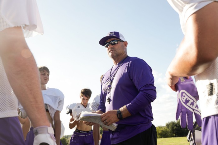 Daniel Boedeker, Shiner's head football coach, talks with players after a drill.