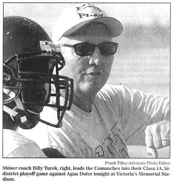 Shiner coach Billy Turek, right, leads the Comanches into their Class 1A area playoff game against Agua Dulce tonight at Victoria's Memorial Stadium. Frank Tilley