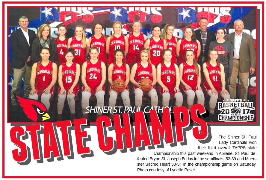 The Shiner St. Paul Lady Cardinals basketball team won the TAPPS 2A state title last weekend ( March 3-4, 2017 ) in Abilene.