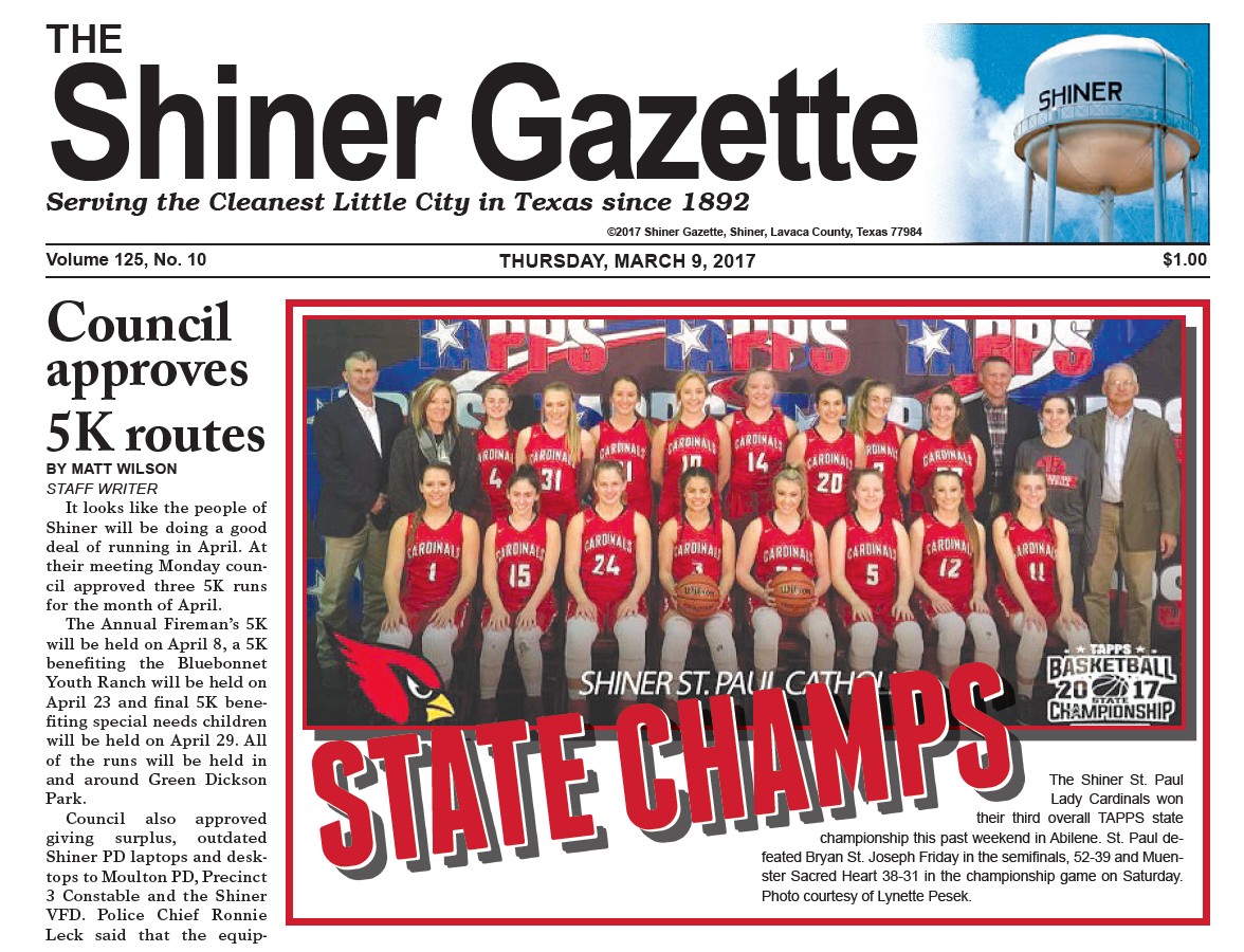 Shiner Gazette Cover Page - St. Paul Lady Cardinals Basketball Team wins TAPPS 2A Championship